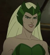 Amora is an extremely beautiful woman with fair skin, green eyes, and long blonde hair which reaches down to her waist. Beneath her thin eyebrows is a hint of green eyeshadow. She has a voluptuous yet athletic physique with toned broad shoulders, buxom breasts, and long legs with shapely thighs. Amora wears a green, skin-tight Asgardian waistcoat-like corset top, which leaves her shoulders bare and exposes her cleavage. She wears tight green arm sleeves that connect from her middle fingers and ride almost up to her upper arms. For bottoms, she has on glossy green low waist hipster bikini briefs. Upon her head is a darker green tiara, and thigh-high green boots cover most of Amora's legs.